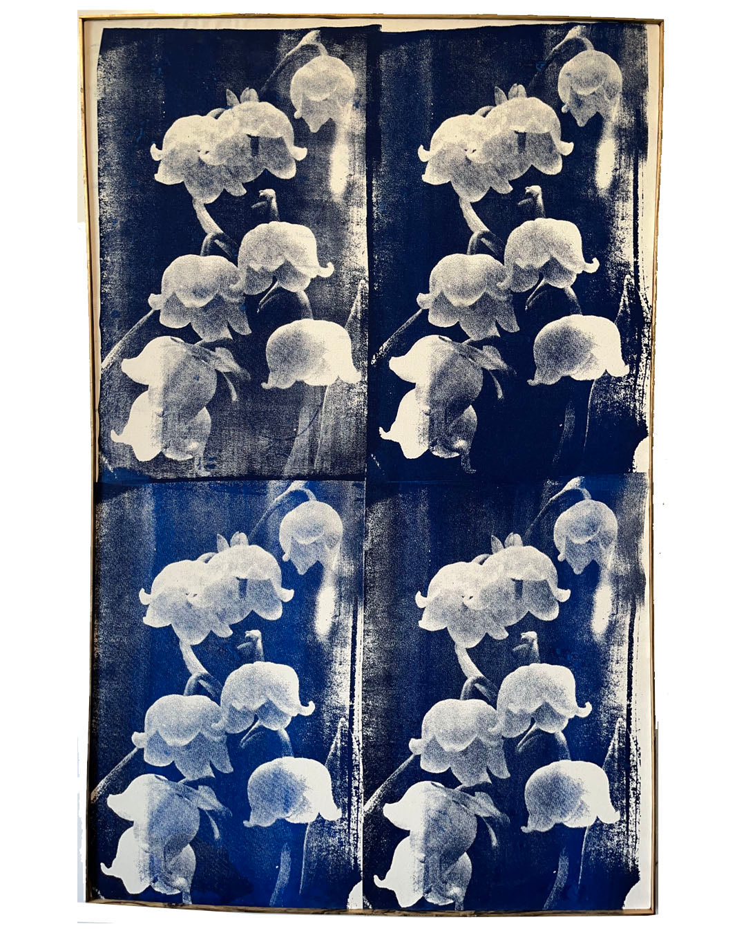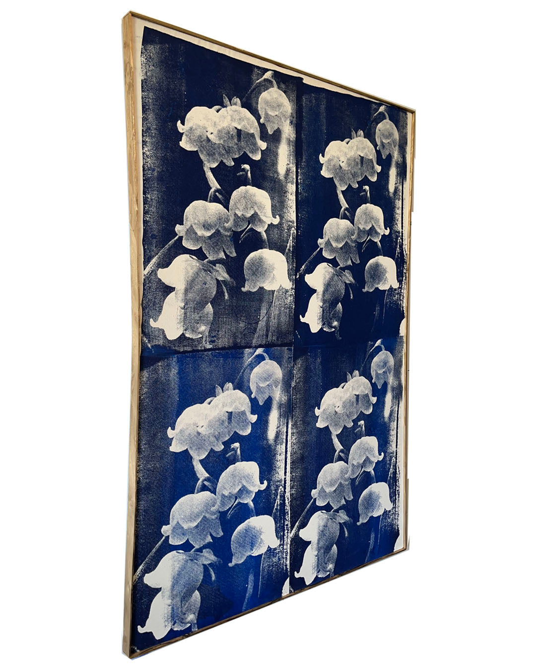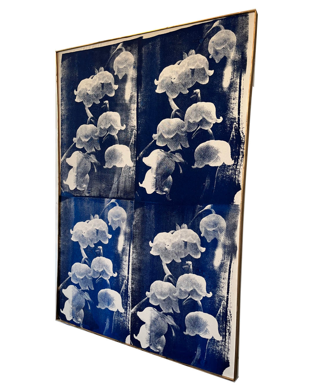 This piece, Valley Variance, is a captivating work by Gabe Aiello II that explores the delicate tension between repetition and individuality through silkscreen techniques on canvas. The composition features four mirrored panels, each showcasing ethereal, white botanical forms—likely inspired by bellflowers or lilies of the valley—against a rich, textured deep blue background.